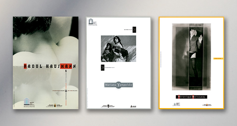Diseños de carteles y catálogos para las respectivas exposiciones de Raoul Hausmann, Mariana Yampolsky y Veronique Boissacq.