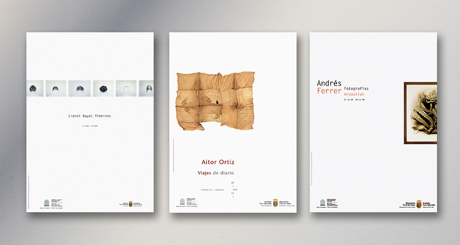Diseño de carteles y catálogos de las respectivas exposiciones de Lionel Bayol, Aitor Ortiz y Andrés Ferrer, celebradas en la sala ATHA (Archivo del Territorio Histórico de Álava), Vitoria.