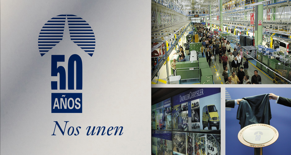 Diseño de la marca 50 Aniversario de Mercedes Benz Fábrica Vitoria, creación de slogans y diseño de los distintos elementos de comunicación del Acto Conmemorativo, módulos expostivos de la Exposición 50 Aniversario y de la Jornada de Puertas Abiertas.
