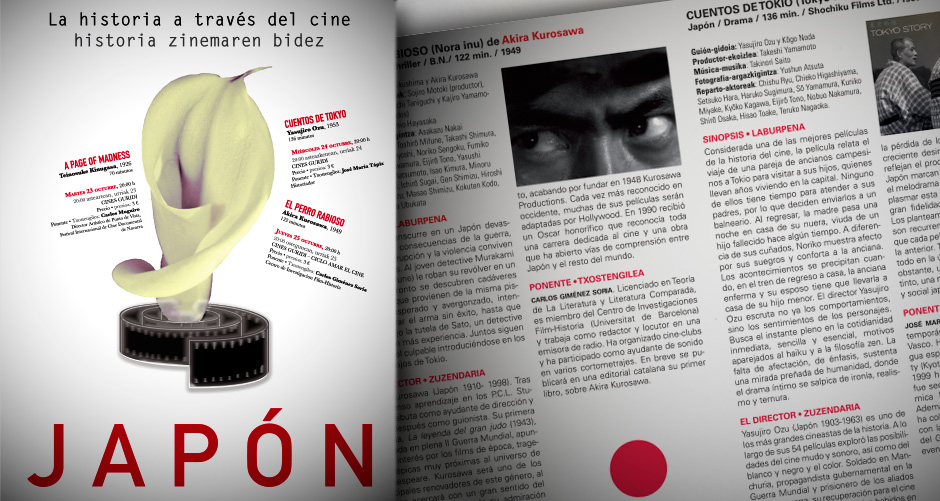 Diseño de cartel y programa sobre el ciclo de cine dedicado a Japón. De las jornadas La historia a través del cine, organizadas por el Instituto de Historia Social Valentín de Foronda, Universidad del País Vasco (EHU / UPV).