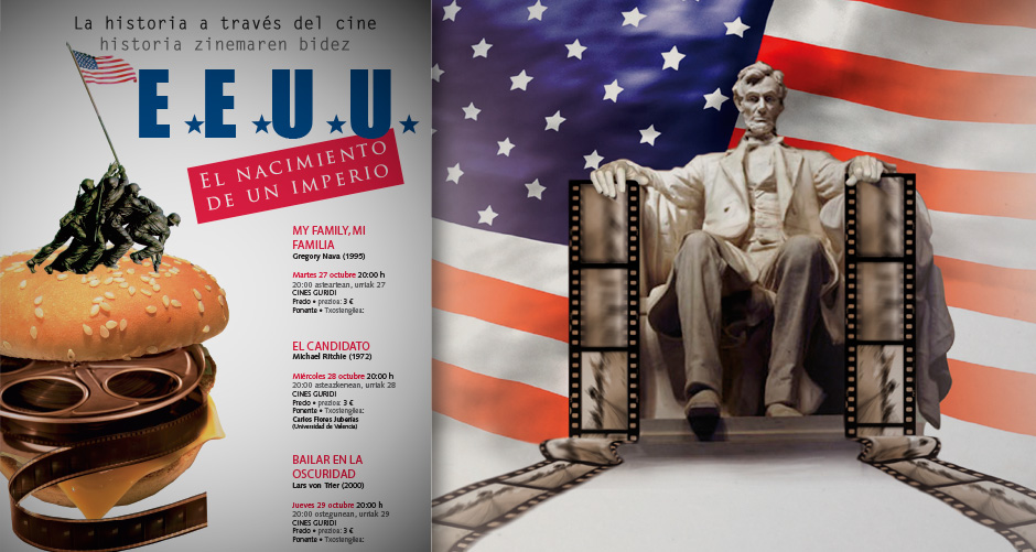 Diseño de cartel y programa sobre dos ciclos de cine dedicado a Estados Unidos. De las jornadas La historia a través del cine, organizadas por el Instituto de Historia Social Valentín de Foronda, Universidad del País Vasco (EHU / UPV).
