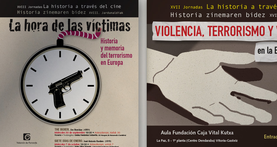 Diseño de carteles sobre dos ciclos de cine dedicado a la violencia, el terrorismo y víctimas en la Europa del s. XX. De las jornadas La historia a través del cine organizadas por el Instituto de Historia Social Valentín de Foronda, Universidad del País Vasco (EHU / UPV).