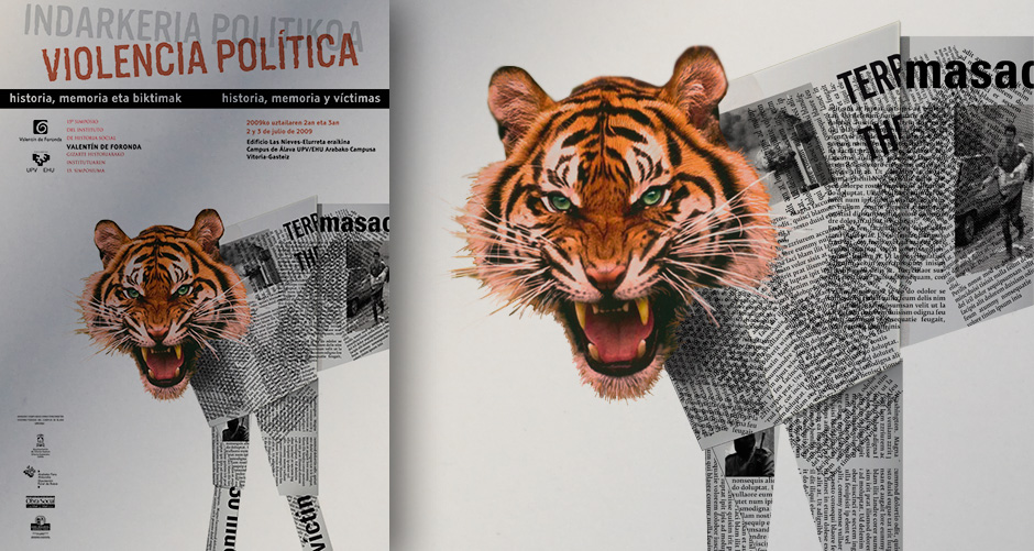Nos inspiramos en la figura «tigres de papel» de la cultura tradicional china, para realizar la imagen de este simposio que abordaba la historia reciente de la violencia política. La imagen del tigre de papel plantea, por una parte, la debilidad y el vacío racional en los que realmente se sustenta este tipo de violencia. Por otra, alude a la utilización–en la época contemporánea– de la repercusión mediática masiva como instrumento amenazante para propagar el terror.