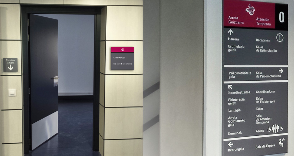 Diseño de la señalización de las instalaciones del Servicio de Atención Temprana del Instituto Foral de Bienestar Social. Este servicio está dirigido a niños y niñas de entre 0 y 6 años que presentan cualquier trastorno en su desarrollo, sea de tipo físico, psíquico o sensorial, o con riesgo de padecerlo, tales como prematuridad, alteraciones congénitas, encefalopatías, retraso psicomotor, etc.